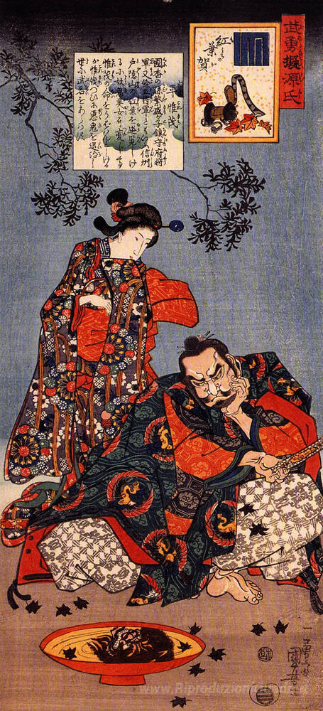 Ti offriamo una riproduzione artigianale su tela dell'opera famosa 'Taira Koremochi spia il riflesso di un demone femminile' di Utagawa Kuniyoshi, dal Museo delle Riproduzioni.
