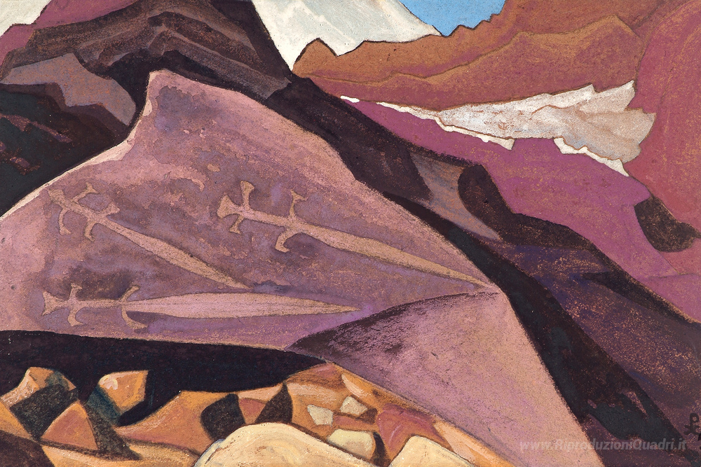 Ti offriamo una riproduzione artigianale su tela dell'opera famosa 'Tre spade. Dipinti sulla pietra.' di Nicholas Roerich, dal Museo delle Riproduzioni.