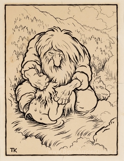 Ti offriamo una riproduzione artigianale su tela dell'opera famosa 'Troll Som vasker Ungen Sin' di Theodor Severin Kittelsen, dal Museo delle Riproduzioni.