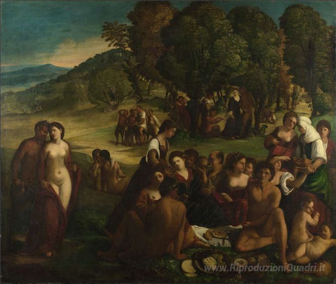 Ti offriamo una riproduzione artigianale su tela dell'opera famosa 'Un Baccanale' di Dosso Dossi, dal Museo delle Riproduzioni.