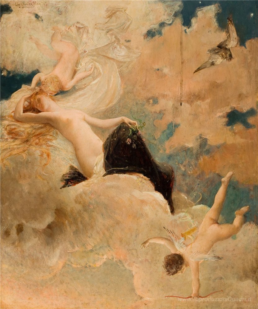 Ti offriamo una riproduzione artigianale su tela dell'opera famosa 'Una bellezza eterea con putti tra le nuvole' di Luc-Olivier Merson, dal Museo delle Riproduzioni.