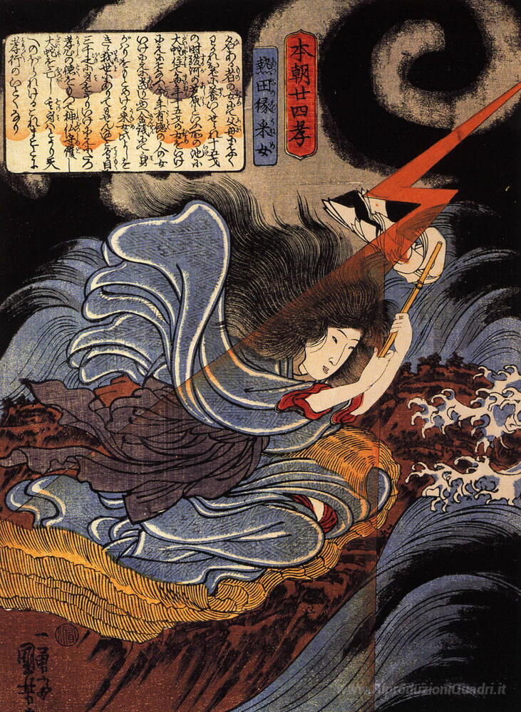 Ti offriamo una riproduzione artigianale su tela dell'opera famosa 'Uneme è esorcizzando il mostruoso serpente dal lago' di Utagawa Kuniyoshi, dal Museo delle Riproduzioni.