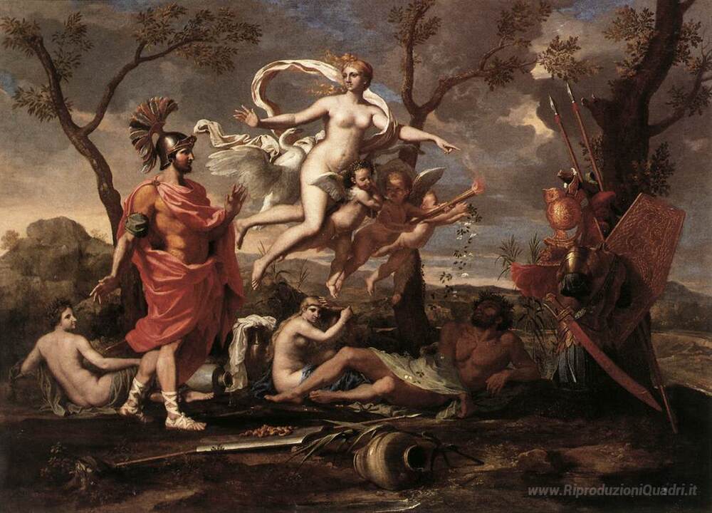 Ti offriamo una riproduzione artigianale su tela dell'opera famosa 'Venere presentavano le armi ad Enea' di Nicolas Poussin, dal Museo delle Riproduzioni.