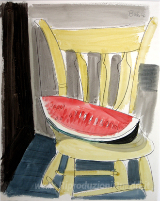 Ti offriamo una riproduzione artigianale su tela dell'opera famosa 'Anguria sulla presidenza' di Jack Bush, dal Museo delle Riproduzioni.