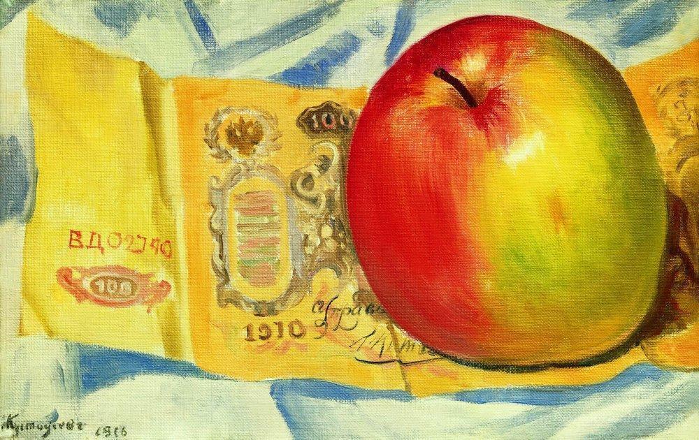 Ti offriamo una riproduzione artigianale su tela dell'opera famosa 'Apple e la banconota da cento rubli' di Boris Kustodiev, dal Museo delle Riproduzioni.