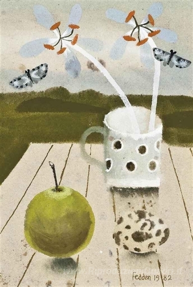 Ti offriamo una riproduzione artigianale su tela dell'opera famosa 'Apple e uova' di Mary Fedden, dal Museo delle Riproduzioni.