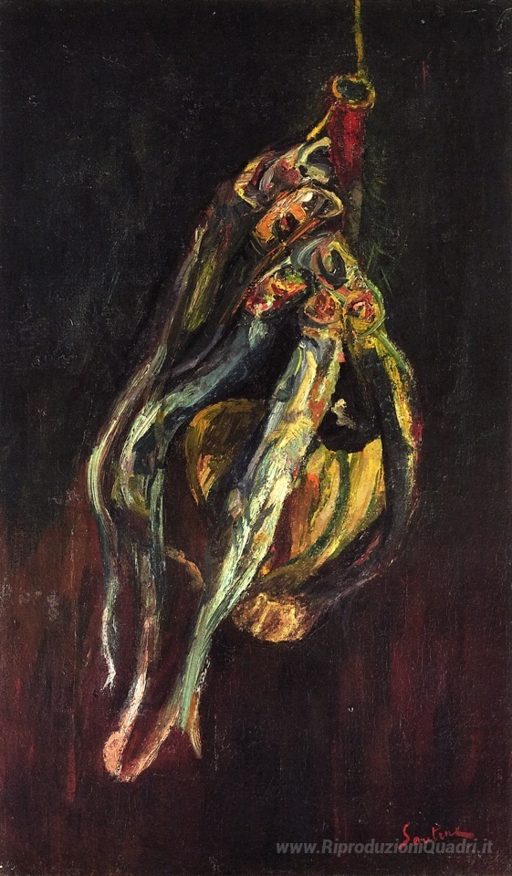 Ti offriamo una riproduzione artigianale su tela dell'opera famosa 'Aringhe e una bottiglia di Chianti' di Chaim Soutine, dal Museo delle Riproduzioni.