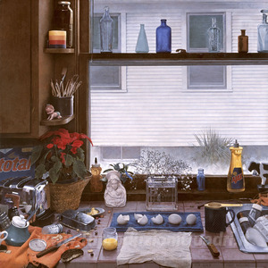Ti offriamo una riproduzione artigianale su tela dell'opera famosa 'Bancone della cucina II (Piatti sporchi II)' di Kent Bellows, dal Museo delle Riproduzioni.
