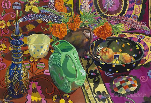 Ti offriamo una riproduzione artigianale su tela dell'opera famosa 'Blu Decanter, Polka-Dot Bowl, Suzani' di Janet Fish, dal Museo delle Riproduzioni.