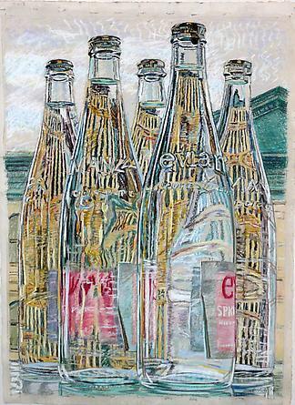 Ti offriamo una riproduzione artigianale su tela dell'opera famosa 'Bottiglie evian' di Janet Fish, dal Museo delle Riproduzioni.