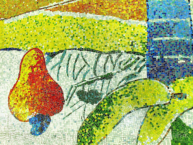 Ti offriamo una riproduzione artigianale su tela dell'opera famosa 'Caju e banane' di Aldemir Martins, dal Museo delle Riproduzioni.