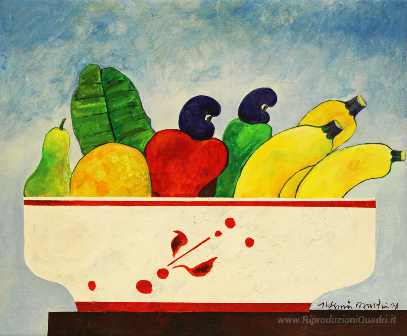 Ti offriamo una riproduzione artigianale su tela dell'opera famosa 'Cesta Com Frutas' di Aldemir Martins, dal Museo delle Riproduzioni.