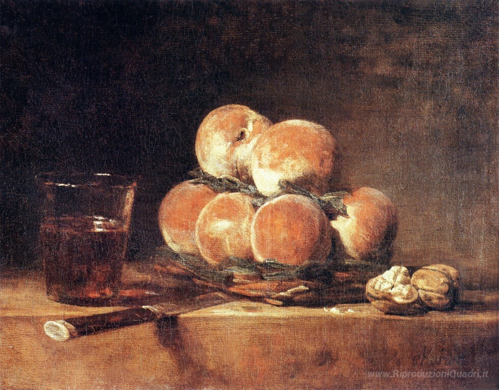 Ti offriamo una riproduzione artigianale su tela dell'opera famosa 'Cesto di pesche' di Jean-Baptiste-Simeon Chardin, dal Museo delle Riproduzioni.