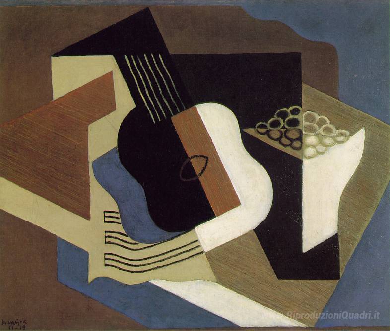 Ti offriamo una riproduzione artigianale su tela dell'opera famosa 'Chitarra e frutta piatto' di Juan Gris, dal Museo delle Riproduzioni.