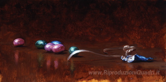 Ti offriamo una riproduzione artigianale su tela dell'opera famosa 'Chocolate Easter Eggs' di Jacob Collins, dal Museo delle Riproduzioni.