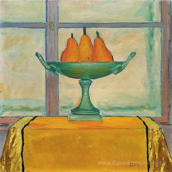 Ti offriamo una riproduzione artigianale su tela dell'opera famosa 'Ciotola di frutta con tre pere rosse e gialle' di Koloman Moser, dal Museo delle Riproduzioni.