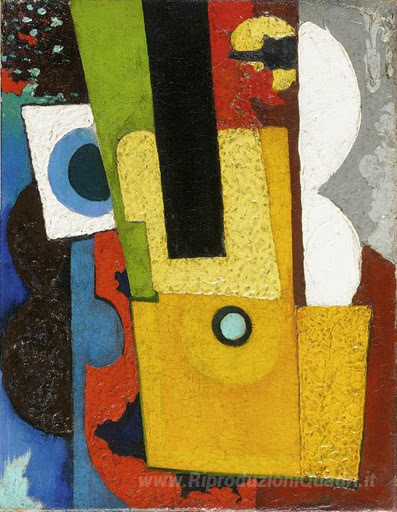 Ti offriamo una riproduzione artigianale su tela dell'opera famosa 'Composizione con la chitarra' di Amadeo de Souza-Cardoso, dal Museo delle Riproduzioni.