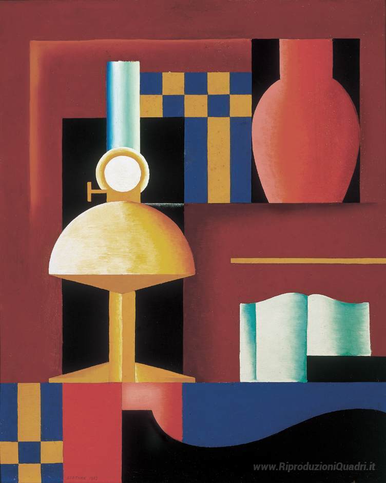 Ti offriamo una riproduzione artigianale su tela dell'opera famosa 'Composizione con Paraffine Lampada, Vaso e Prenota' di Sandor Bortnyik, dal Museo delle Riproduzioni.