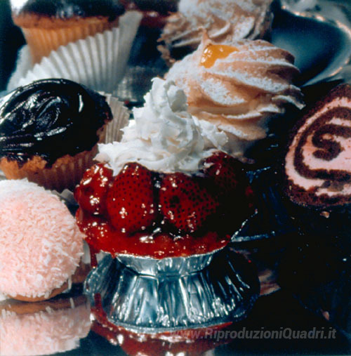 Ti offriamo una riproduzione artigianale su tela dell'opera famosa 'Crostata di fragole Supreme' di Audrey Flack, dal Museo delle Riproduzioni.