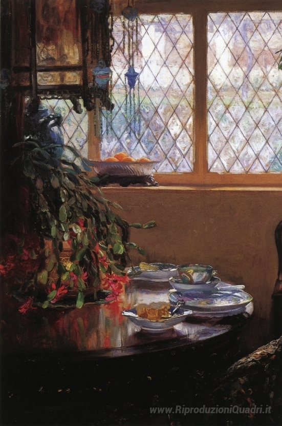 Ti offriamo una riproduzione artigianale su tela dell'opera famosa 'Dalla finestra Dining Room' di Guy Rose, dal Museo delle Riproduzioni.