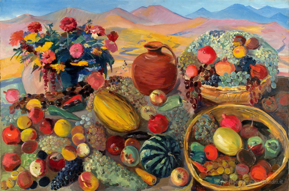 Ti offriamo una riproduzione artigianale su tela dell'opera famosa 'Doni dell'autunno' di Martiros Saryan, dal Museo delle Riproduzioni.