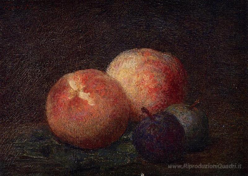 Ti offriamo una riproduzione artigianale su tela dell'opera famosa 'Due pesche e prugne due' di Henri Fantin-Latour, dal Museo delle Riproduzioni.