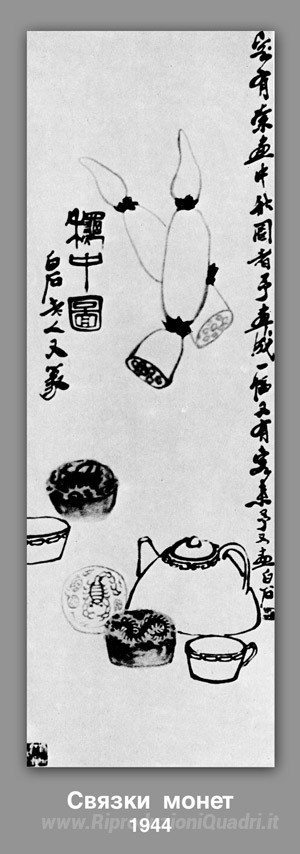 Ti offriamo una riproduzione artigianale su tela dell'opera famosa 'Fasci di monete' di Qi Baishi, dal Museo delle Riproduzioni.