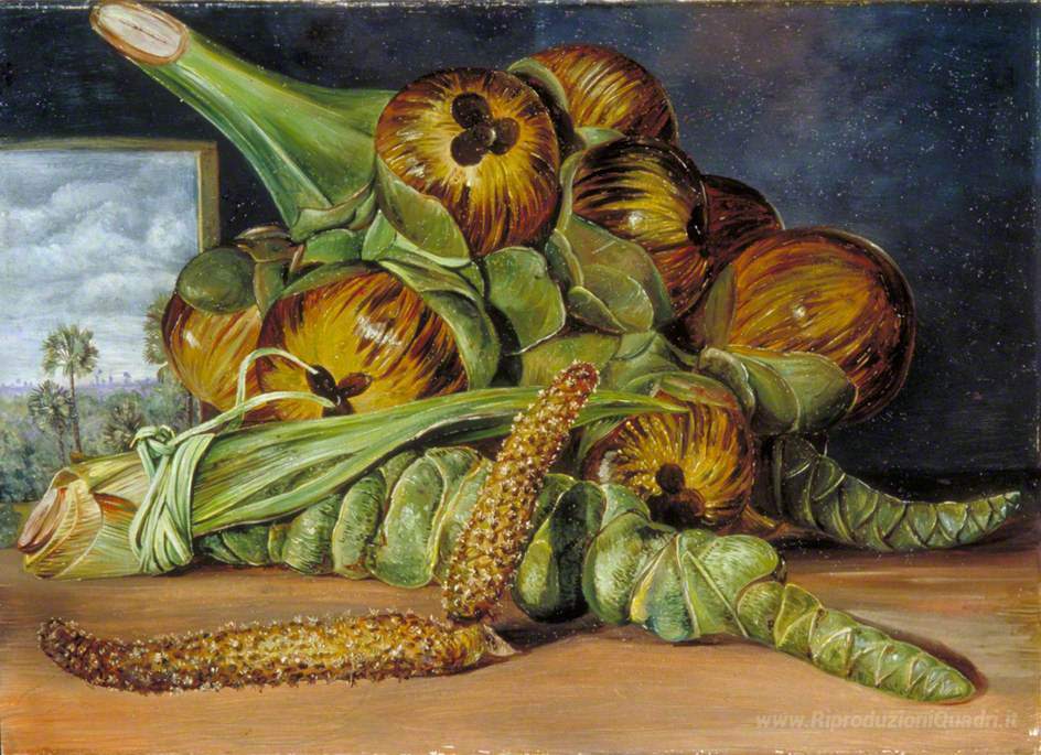Ti offriamo una riproduzione artigianale su tela dell'opera famosa 'Fiori e frutta di Palmyra, e il Palm Visto attraverso una finest' di Marianne North, dal Museo delle Riproduzioni.
