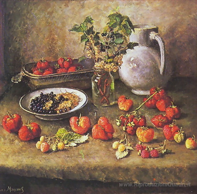 Ti offriamo una riproduzione artigianale su tela dell'opera famosa 'Fragola e vaso bianco' di Ilya Mashkov, dal Museo delle Riproduzioni.
