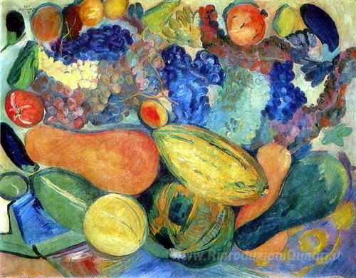 Ti offriamo una riproduzione artigianale su tela dell'opera famosa 'Frutta e verdura' di Martiros Saryan, dal Museo delle Riproduzioni.