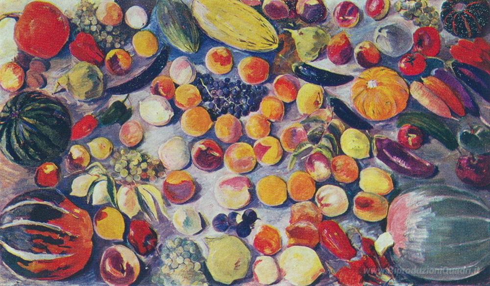 Ti offriamo una riproduzione artigianale su tela dell'opera famosa 'Frutta e verdura' di Martiros Saryan, dal Museo delle Riproduzioni.