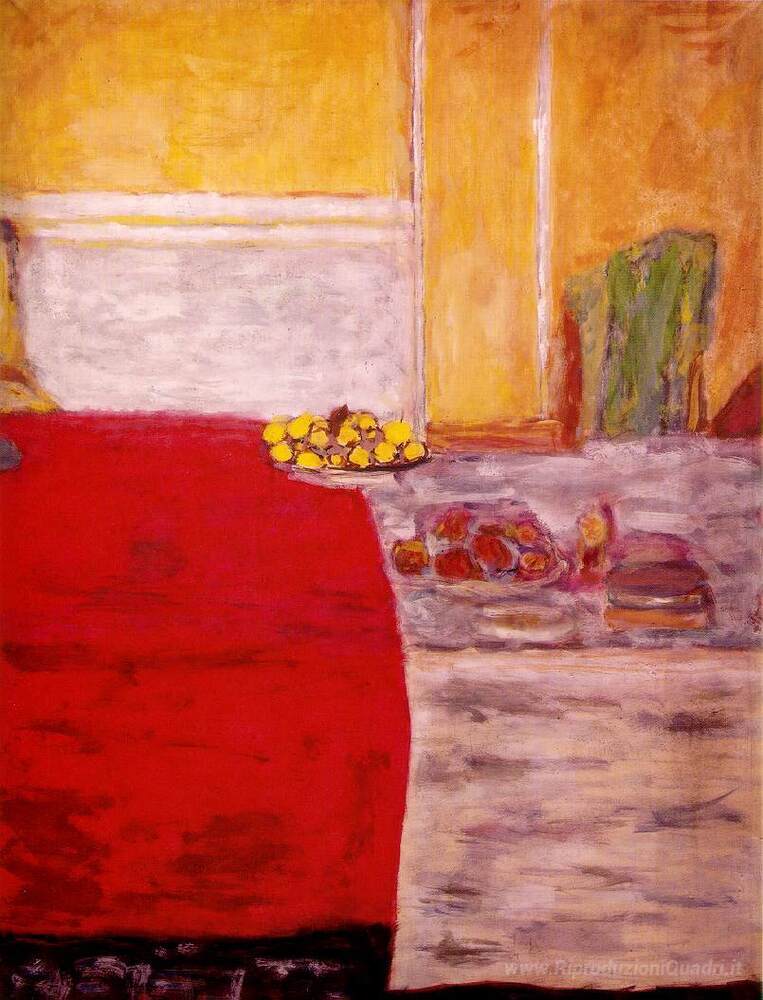 Ti offriamo una riproduzione artigianale su tela dell'opera famosa 'Frutta sul tappeto rosso' di Pierre Bonnard, dal Museo delle Riproduzioni.