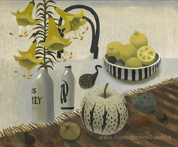 Ti offriamo una riproduzione artigianale su tela dell'opera famosa 'Gigli e limoni' di Mary Fedden, dal Museo delle Riproduzioni.
