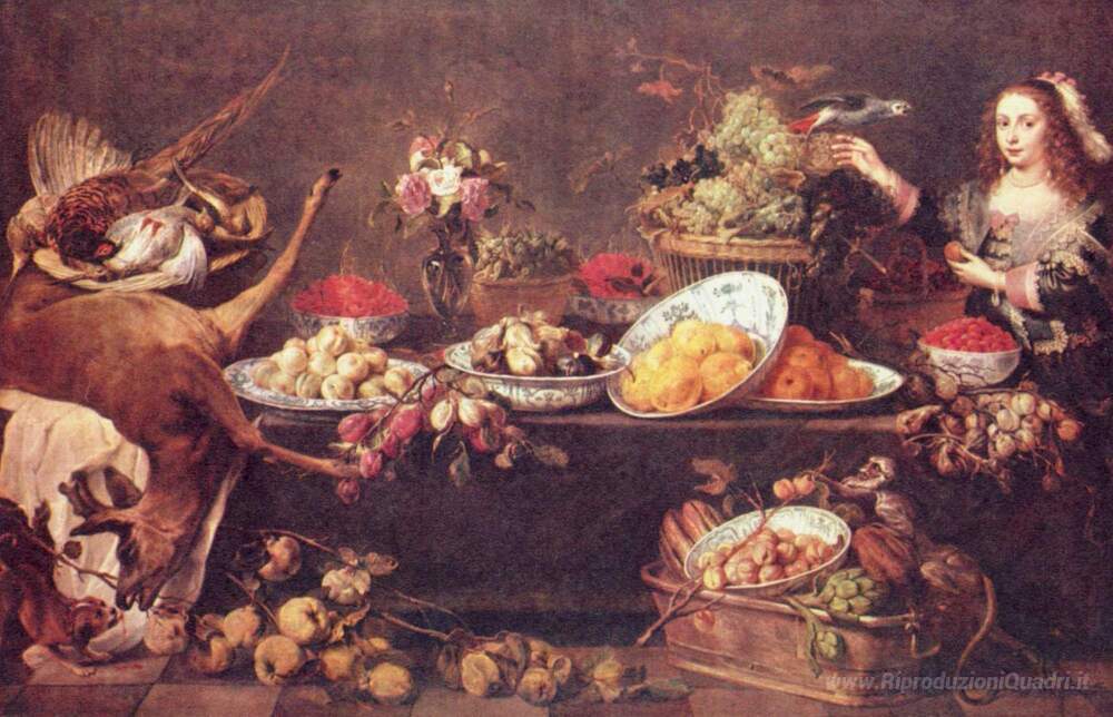 Benvenuti nella nostra selezione esclusiva di dipinti a olio italiani, dove la maestria artistica incontra la tradizione secolare. Oggi vi presentiamo l'opera straordinaria Grande natura morta con una signora e pappagallo, dipinta dal rinomato artista fiammingo Frans Snyders, noto per la sua abilità nel ritrarre la bellezza della natura e delle figure umane. Snyders, spesso associato alla pittura di stille life e alla complicità di scene di vita quotidiana, utilizza tecniche di chiaroscuro che conferiscono profondità e vibrante vitalità ai suoi soggetti.
