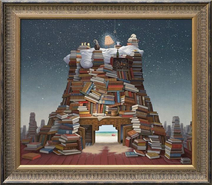 Ti offriamo una riproduzione artigianale su tela dell'opera famosa 'Lettura notturna' di Jacek Yerka, dal Museo delle Riproduzioni.
