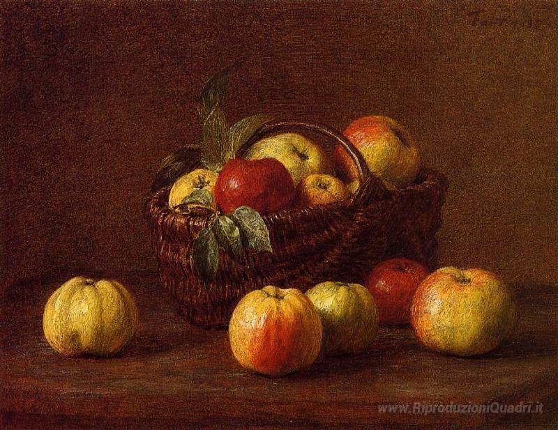 Ti offriamo una riproduzione artigianale su tela dell'opera famosa 'Mele in un cesto su un tavolo' di Henri Fantin-Latour, dal Museo delle Riproduzioni.