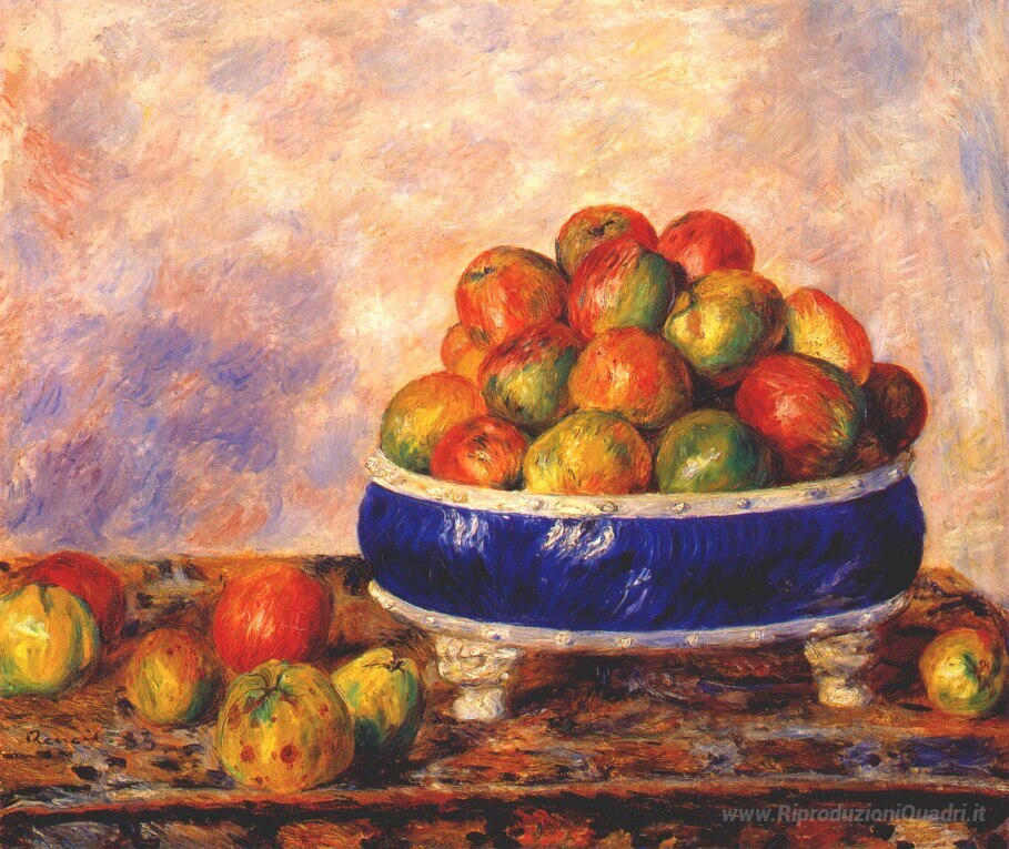 Ti offriamo una riproduzione artigianale su tela dell'opera famosa 'Mele in un piatto' di Pierre-Auguste Renoir, dal Museo delle Riproduzioni.