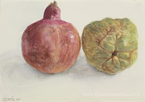 Ti offriamo una riproduzione artigianale su tela dell'opera famosa 'Melograno e Quince' di Avigdor Arikha, dal Museo delle Riproduzioni.