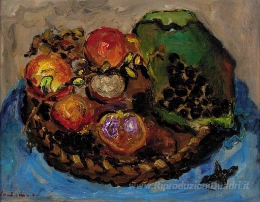 Ti offriamo una riproduzione artigianale su tela dell'opera famosa 'Natura morta alla frutta' di Giuseppe Santomaso, dal Museo delle Riproduzioni.