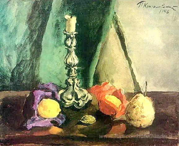 Ti offriamo una riproduzione artigianale su tela dell'opera famosa 'Natura morta. Candeliere e pera.' di Pyotr Konchalovsky, dal Museo delle Riproduzioni.