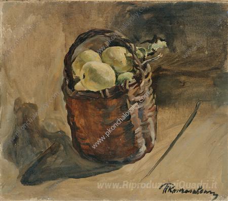 Ti offriamo una riproduzione artigianale su tela dell'opera famosa 'Natura morta. Cesto di mele sul pavimento.' di Pyotr Konchalovsky, dal Museo delle Riproduzioni.