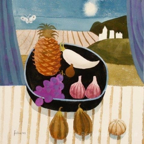 Ti offriamo una riproduzione artigianale su tela dell'opera famosa 'Natura morta con ananas e la farfalla' di Mary Fedden, dal Museo delle Riproduzioni.