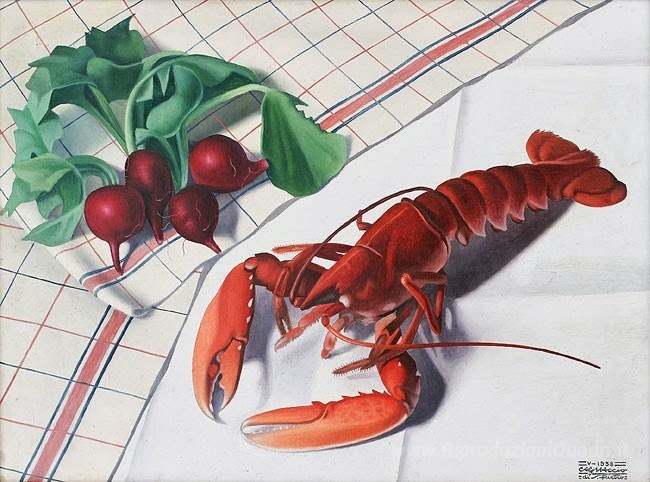 Ti offriamo una riproduzione artigianale su tela dell'opera famosa 'Natura morta con aragosta e Ravanelli' di Cagnaccio di San Pietro, dal Museo delle Riproduzioni.