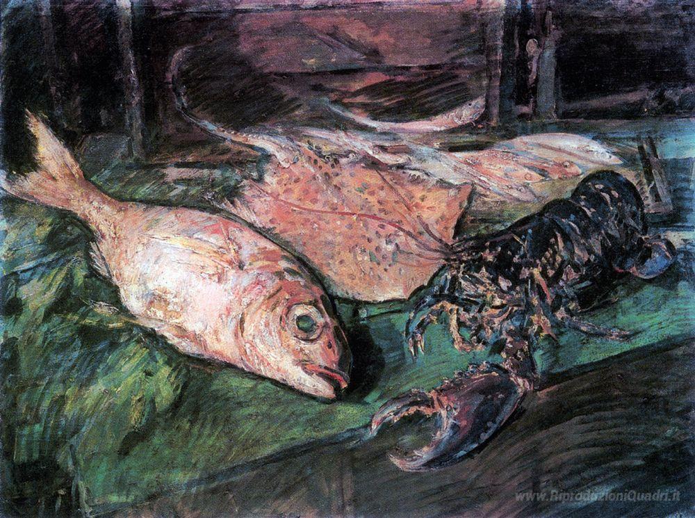 Ti offriamo una riproduzione artigianale su tela dell'opera famosa 'Natura morta con aragosta' di Konstantin Korovin, dal Museo delle Riproduzioni.