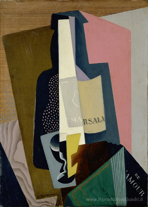 Ti offriamo una riproduzione artigianale su tela dell'opera famosa 'Natura morta con bottiglia di Marsala' di Gino Severini, dal Museo delle Riproduzioni.