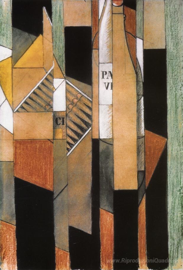 Ti offriamo una riproduzione artigianale su tela dell'opera famosa 'Natura morta con bottiglia e sigari' di Juan Gris, dal Museo delle Riproduzioni.