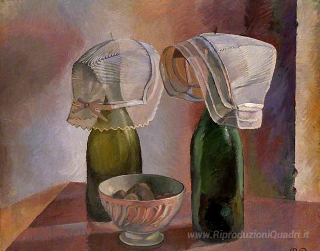 Ti offriamo una riproduzione artigianale su tela dell'opera famosa 'Natura morta con bottiglie e cofani Breton' di Pierre Roy, dal Museo delle Riproduzioni.