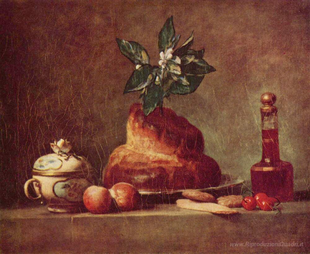 Ti offriamo una riproduzione artigianale su tela dell'opera famosa 'Natura morta con Brioche' di Jean-Baptiste-Simeon Chardin, dal Museo delle Riproduzioni.