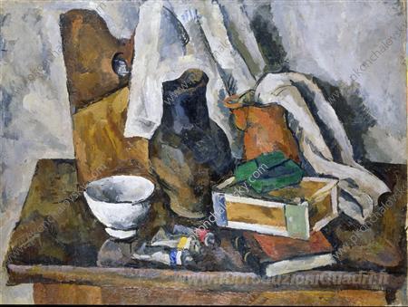Ti offriamo una riproduzione artigianale su tela dell'opera famosa 'Natura morta con brocca' di Pyotr Konchalovsky, dal Museo delle Riproduzioni.
