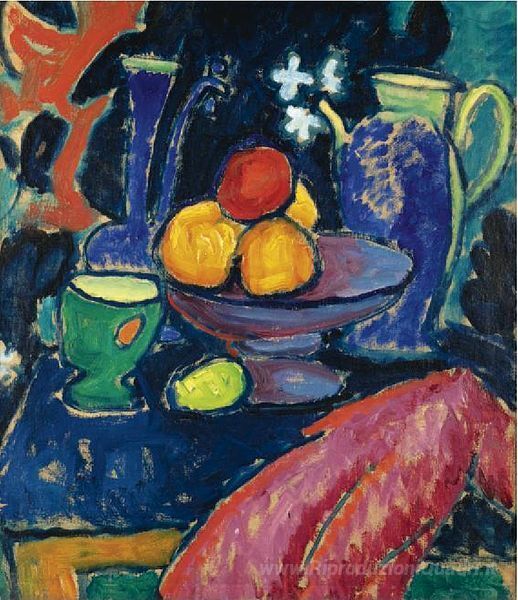 Ti offriamo una riproduzione artigianale su tela dell'opera famosa 'Natura morta con brocca' di Alexej von Jawlensky, dal Museo delle Riproduzioni.